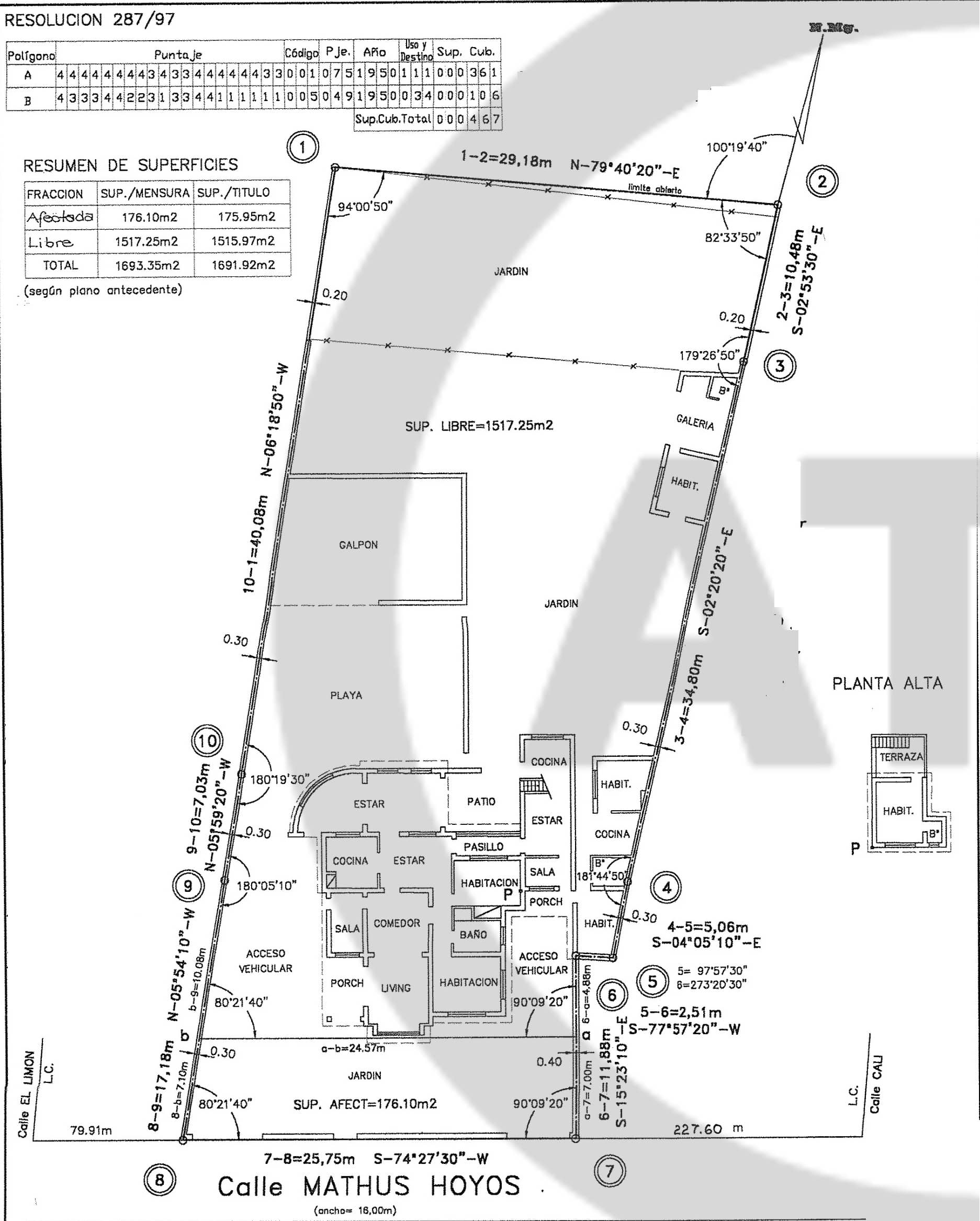 Dimensiones del Terreno: 25,75 de frente (Sur), 64,29 m lado Oeste, 29,18 m lado Norte.